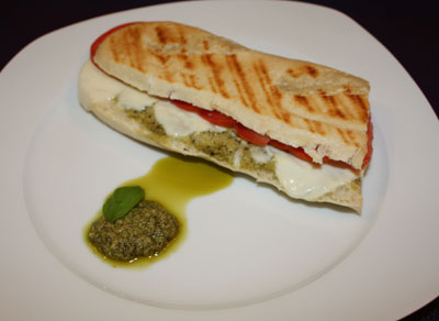 Zubereitung: Baguett mit Pesto bestreichen. Mozarella und Tomaten darauf verteilen und etwas Salzen. Geschlossenes Baguett mit Backpapier in den Plattengriller geben und anschließend mit Pesto servieren. |