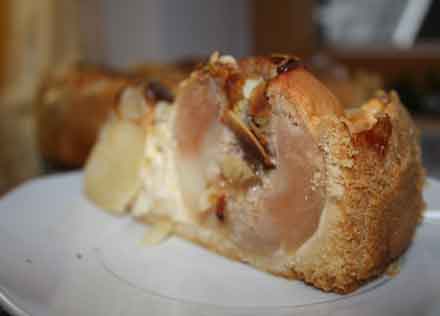 Der Teig wird in eine gefettete Springform eingebracht und ein ca. 3 cm hoher Rand hochgezogen. Nun die Äpfel in die Form setzen und die Füllung in die Äpfel geben. Paar Mandelsplitter über den Boden und zwischen die Äpfel streuen.
