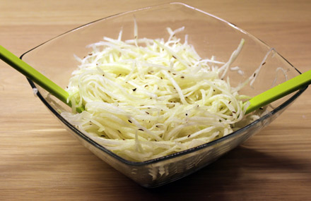 Zubereitung: Kohlrabi schälen und hacheln - dann anrichten und genießen. |