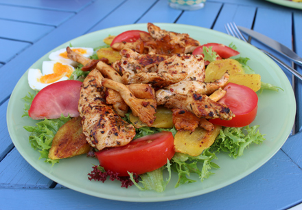 Salat marinieren und auf den Tellern ausbreiten. Die gekochten Kartoffeln in Scheiben schneiden und mit wenig Öl und etwas Salz kräftig anbraten. Danach das marinierte Hühnerfleisch und die Eierschwammerl anbraten und auch auf den Salat. Alles schön garnieren und servieren.
