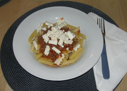 Zutaten: Zutaten für 6 Portionen: Ich hab einfach ein normales Sugo gemacht und Feta darunter gemischt - war auch lecker.
