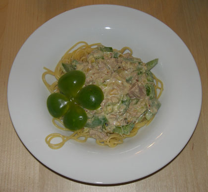 1 Zwiebel 1 Dose Thunfisch 2 Paprika (verschiedene Farben) 1 Suppenwürfel 1/2 Becher Sauerrahm Gewürze (für 2 Personen)