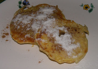 Die oben genannten Zutaten Mixen. Äpfel schälen, entkernen und in Scheiben schneiden - durch den Teig ziehen und ab in die Pfanne damit. Mit Zimt und Zucker servieren!