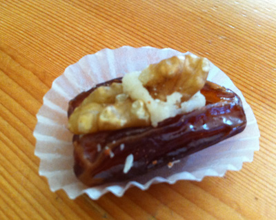 Datteln aufschneiden - mit Nougat und Marzipan füllen und eine halbe Wahlnuss darauf. |