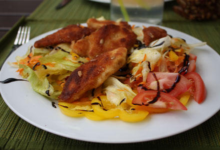Zubereitung: Kleine Schnitzerl mit Sonnenblumenkernen in der Bröselmischung panieren und auf dem frisch angerichteten Salat garnieren und mit Balsymikocreme verziern. |