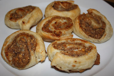 Blätterteig ausrollen mit Nussmasse bestreichen. Zusammenrollen, in Scheiben schneiden und ab ins Rohr. |