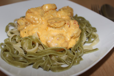 Zwiebel kleinschneiden und mit den TK Scampi in der Pfanne anbraten. Anschließend QimiQ und etwas Curry dazu geben und köcheln lassen. |