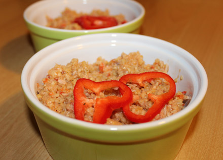 2 Tassen Wasser mit Brühe zum Kochen bringen. Bulgur einrühren, vom Herd nehmen und 10 Minuten quellen lassen. Überschüssiges Wasser abgießen. |