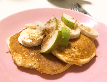 Zutaten: 3 große Eier Dazu gibt es bei uns frisches Obst und Ahornsirup.